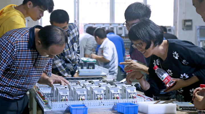 在車間,同學們看著工人熟練而又嚴謹地給電箱接線,一片肅穆。有同學低聲道:“我們平時也接線,但與他們比較起來,就做得太粗糙。”有時候距離的產生僅僅在于態度。在匯興,你可以體驗科技,學習知識,權衡方法。