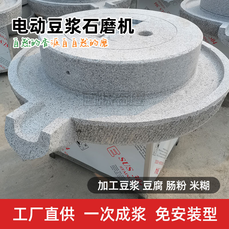 電動石磨磨漿機是一種傳統古老和現代生產結合的新穎的自動濕式磨碎設備,使用于大米、大豆、玉米、署類等糧食類物料的濕磨加工,也使用于醫藥、制糖、食品等工業中某些物料的濕磨。當經過清理、浸泡等預處理后的物料由進入料斗入磨后,在離心力的作用下進入相對運動的上、下石磨磨盤之間,由于物料的相互沖擊、擠壓和石磨盤的剪切、搓撕等綜合作用,使物料沿石盤平面從里到外、由粗到細地達到磨碎目的。